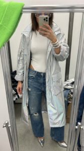 Forget everything you know about the classic beige raincoat because 2026 is all about iridescent fabrics and utility pockets. This look screams “I have a private jet to catch” even if you’re just headed to the grocery store. It is the perfect blend of high-fashion drama and practical weatherproofing.